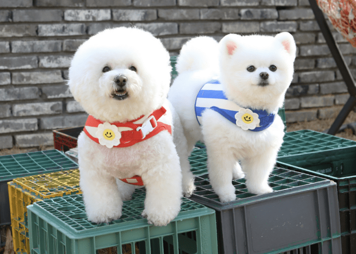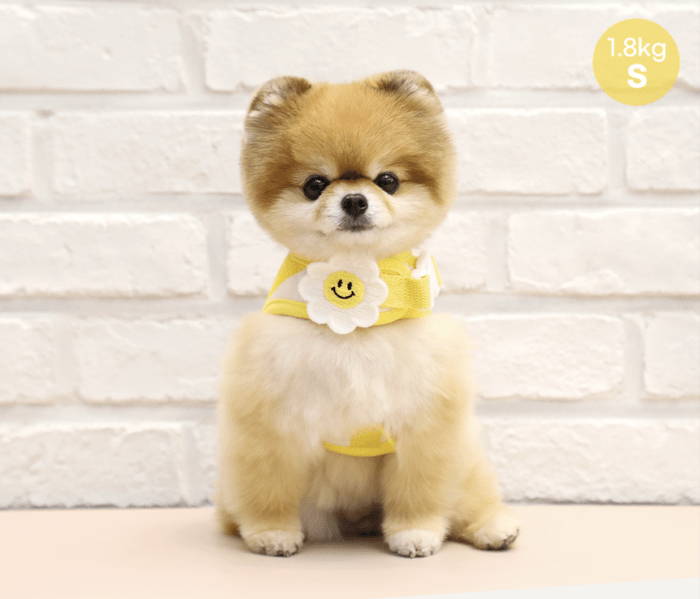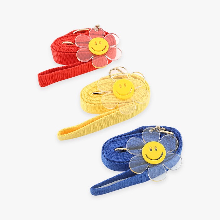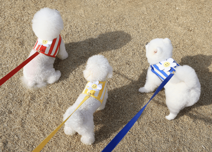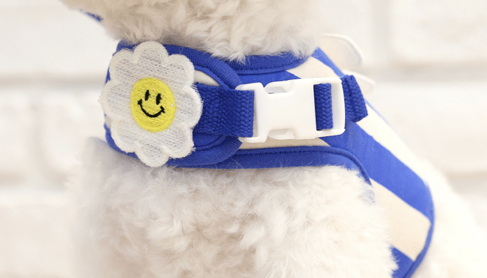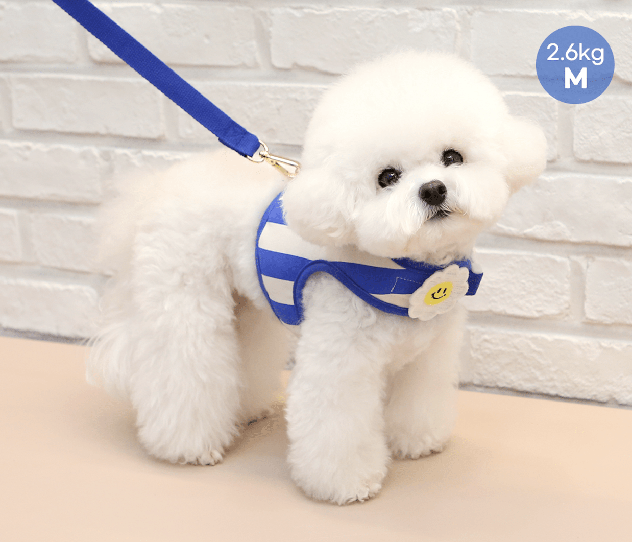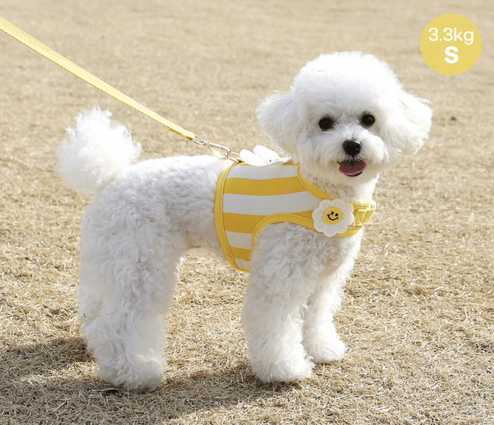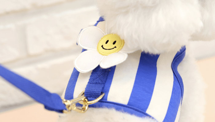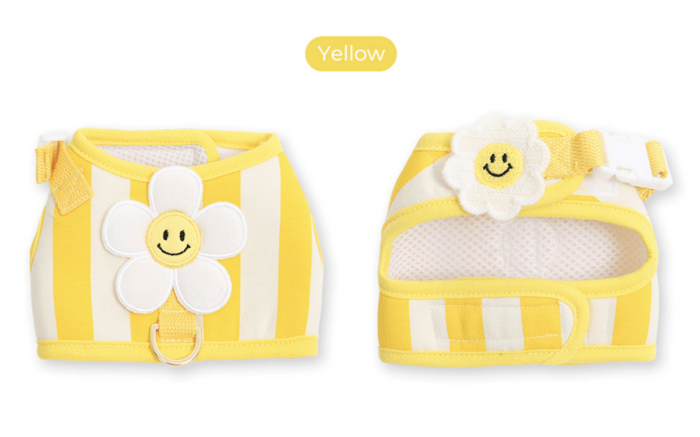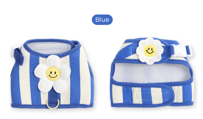 This charming harness features a fresh stripe pattern, with a soft, plump embroidery on the back and a sweet smiley flower detail around the neck. Its casual yet stylish design pairs effortlessly with any color, making it a versatile addition to any wardrobe.