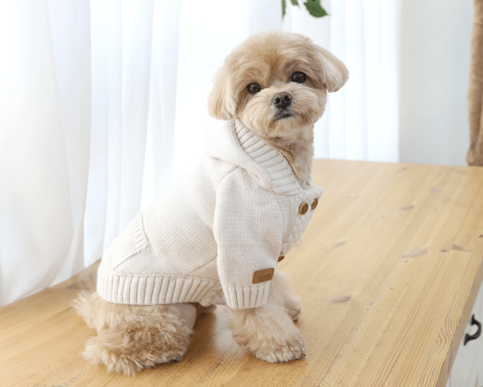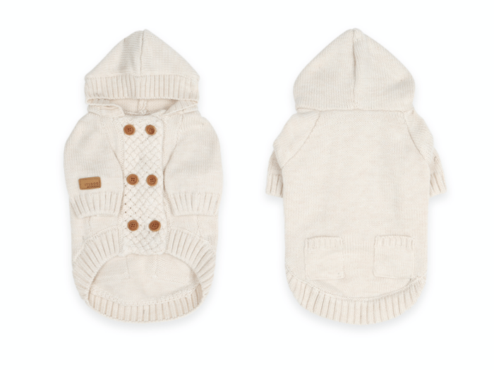 This cozy sweater is perfect for cool autumn evenings and chilly winter days, offering warmth and comfort thanks to its soft, thick material. Its elegant yet simple design, paired with excellent stretch, ensures a perfect fit for your little one. The classic wooden buttons and buttoned back pockets, with their unique weave detailing, add a touch of luxury. A stylish leather label adorns the right sleeve, and a sweet hood is included to keep the neck warm. In a versatile ivory shade, this sweater complements all hair colors beautifully!
